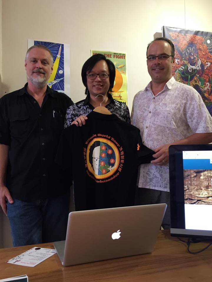 The Bitcoin Ambassador was overjoyed and honored to meet up with the world’s top Bitcoiners and presented the limited edition Bitcoin World Tour polo T-shirt to them! — with Stephen DeMeulenaere, Ric Shreves and Oscar Darmawan at Paradiso Ubud.