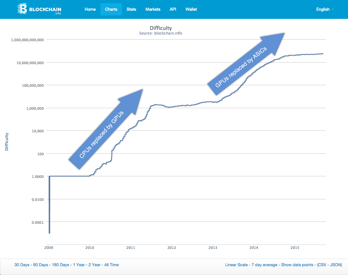 In 2009, at first people could mine successfully on their laptops and home computers, using the CPU (Central Processing Unit) to do the calculations. There seemed to be a gentleman’s agreement not to use more powerful GPUs (graphics cards, the chips that make screens work) that were more efficient and faster at running this specific calculation, but harder to set up. However that gentleman’s agreement seems to have had broken down, and GPU mining made CPU mining obsolete and caused drove a large increase in mining difficulty between 2010-12.