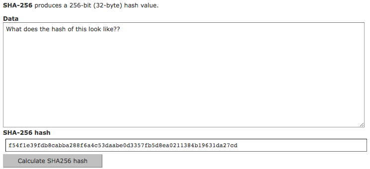 You can play with hashing here: Go to http://www.xorbin.com/tools/sha256-hash-calculator and type some data into the big box. You’ll see the hash in the smaller box. I typed “What does the hash of this look like?”: